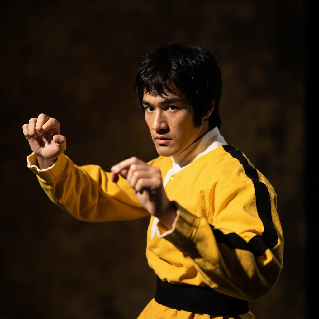 [IMAGE: Bruce Lee in a focused martial arts stance demonstrating his signature intensity and form]